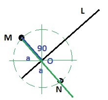 1) Опускаем перпендикуляр из точки M к прямой L - отрезок МО.