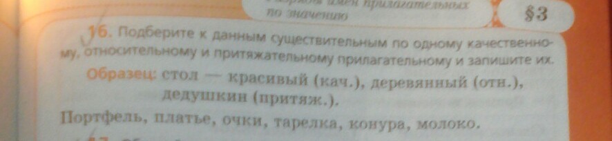 Подберите к данным существительным по одному качественному, относительному и притяжаиельному прилагательному и запишите их.