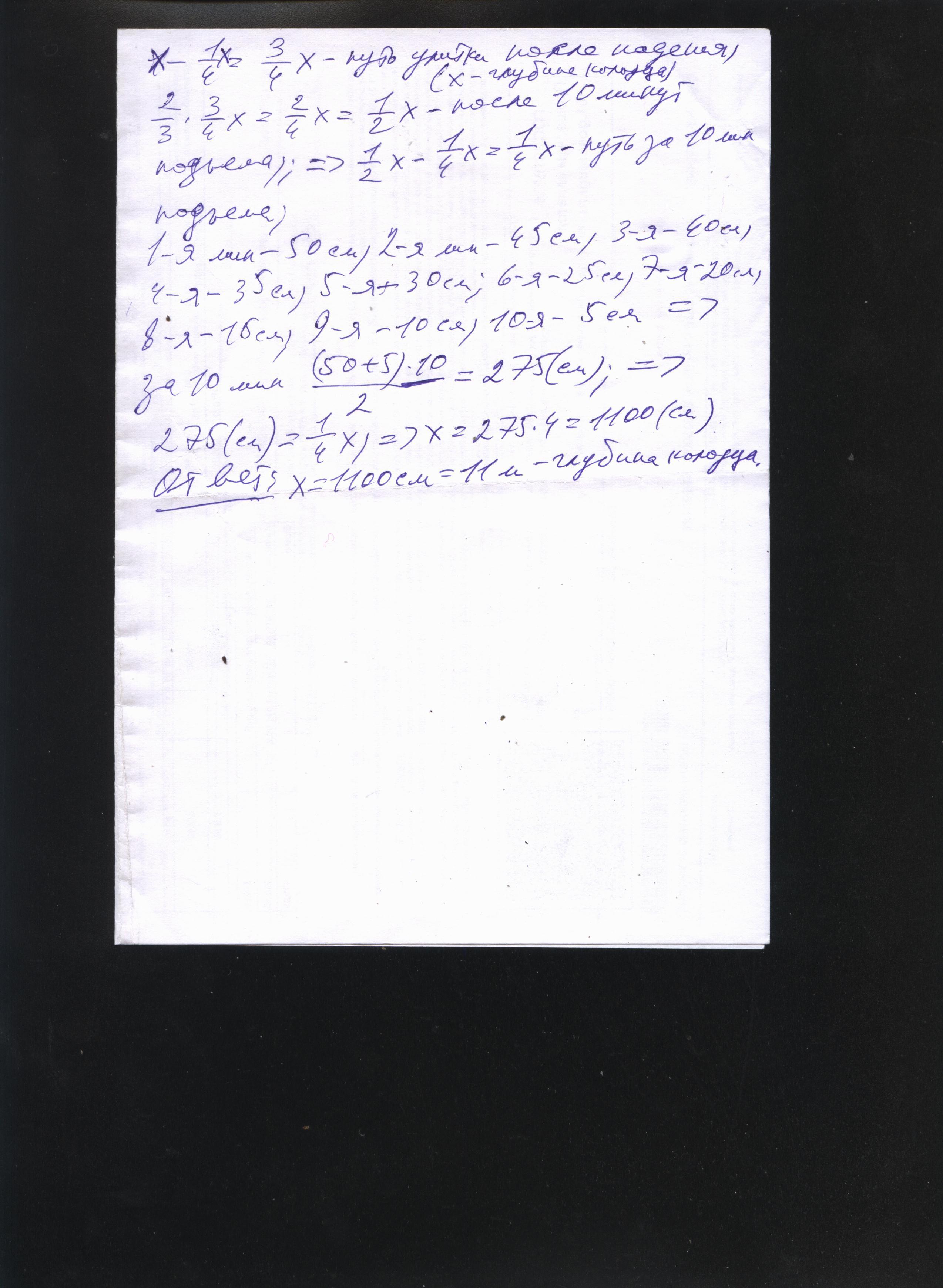 Улитка, длина туловища которой 5 см, хочет выползти из сырого колодца, используя для этого вертикальные стены. Улитка поднимается на 10 размеров своего туловища за 1 минуту, на 9 размеров за вторую и т.п. После 10 минут подъема улитка останавливается для небольшого отдыха. Отдохнув, она продолжает двигаться в той же манере. Улитка стартовала со дна колодца, но на полпути соскользнула вниз и оказалась на высоте, равной 1/4 всей глубины колодца. Здесь она отдохнула снова, и затем, после 10 мин. подъема тем же способом. что и раньше, она была все ещё только на 2/3 оставшейся ей дороги наверх. Какова глубина колодца?