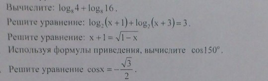 1 вычислите 2 решите уравнение 3 решите уравнение 4 используя формулы приведения, вычислите косинус 150гр 5 решите уравнение