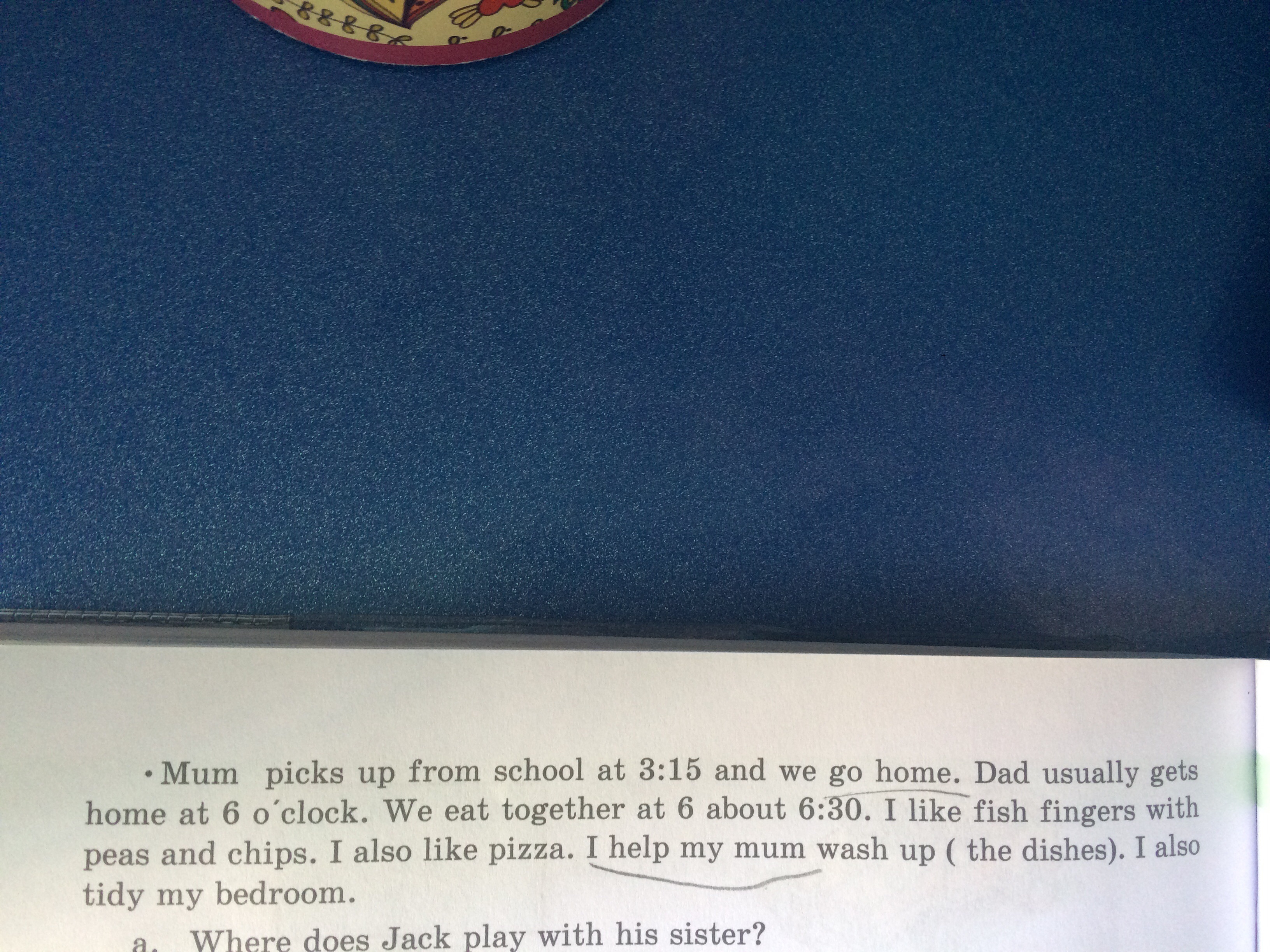 Мама забирает нас из школы в 3-15 и мы отправляемся домой. Папа обычно приходит домой в 6 часов.Мы ужинаем вместе от 6 до 6-30.Я люблю рыбьи плавники с горошком и чипсами. Я также люблю пиццу.