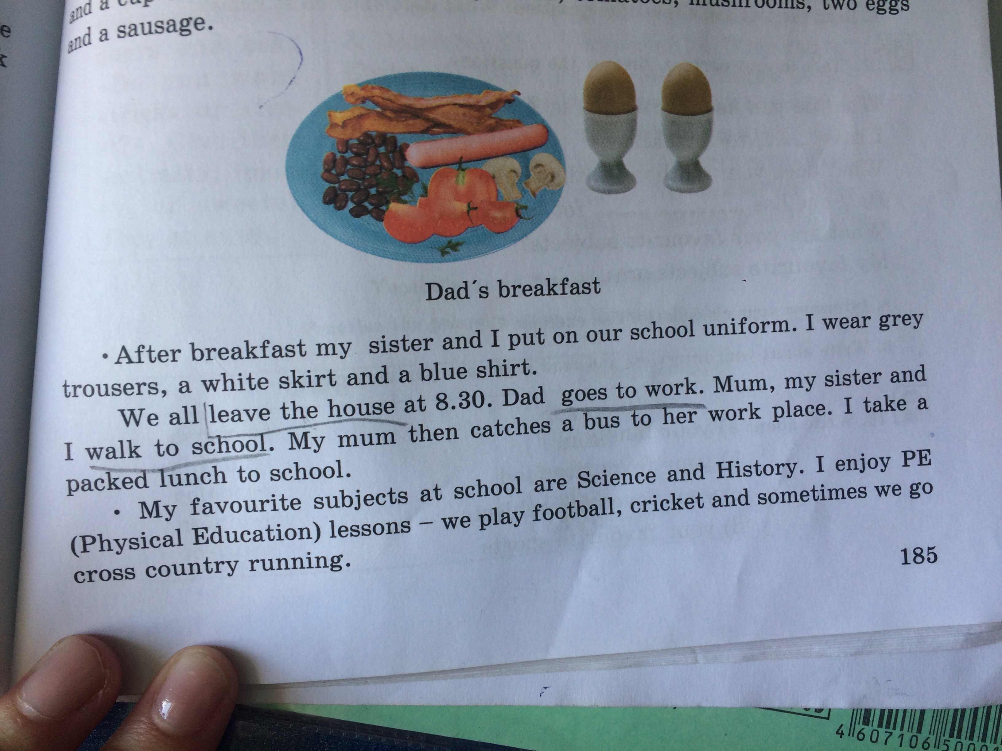 Мы все выходим из дома в 8-30. Папа идёт на работу, мама, моя сестра и я идём в школу. Затем мама садится на автобус, чтобы ехать на работу. Я ношу с собой в школу готовый завтрак.