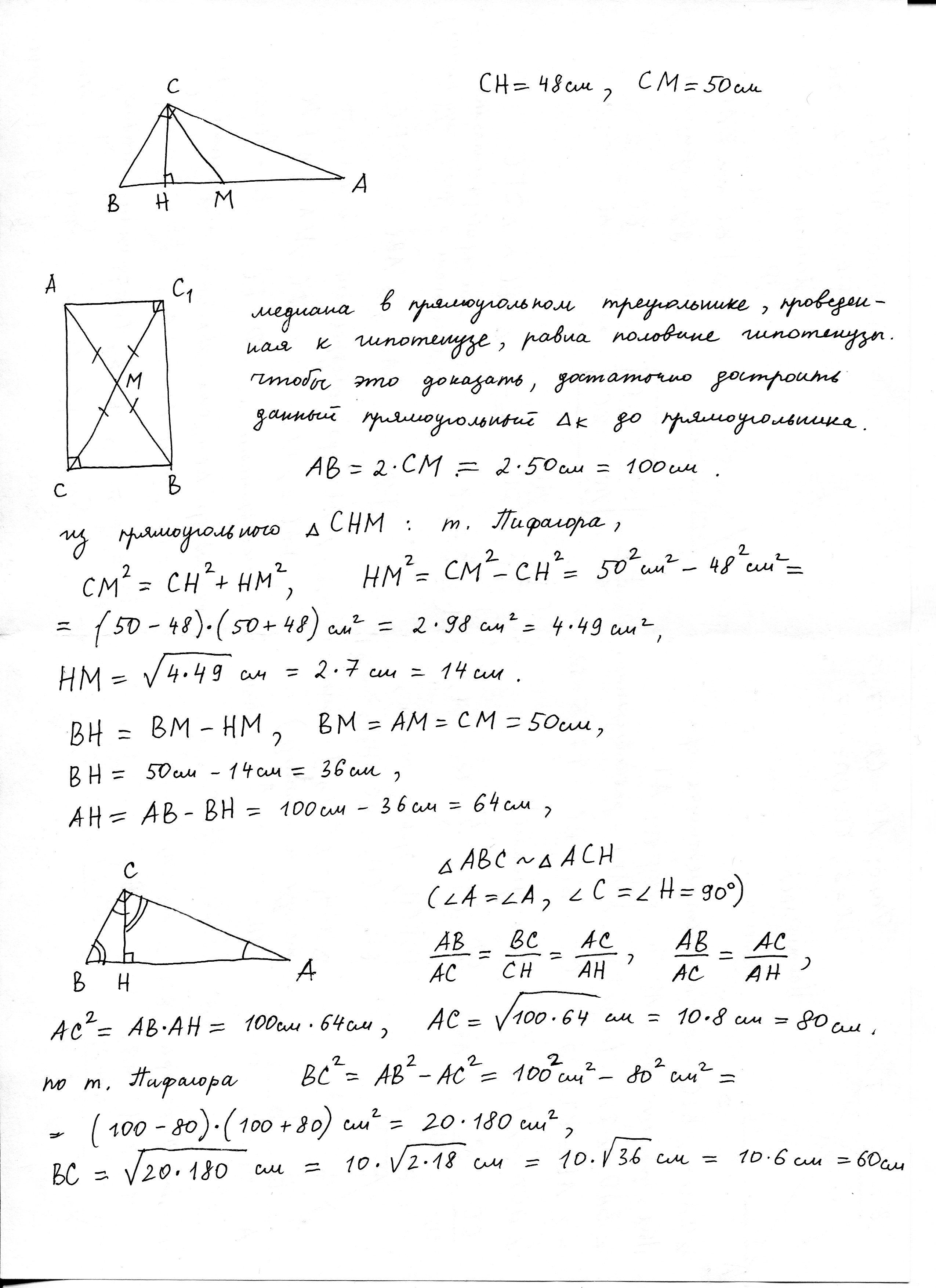 Медиана и высота прямоугольного треугольника, проведенные к гипотенузе, равны соответственно 50 см и 48 см. Найдите стороны треугольника.