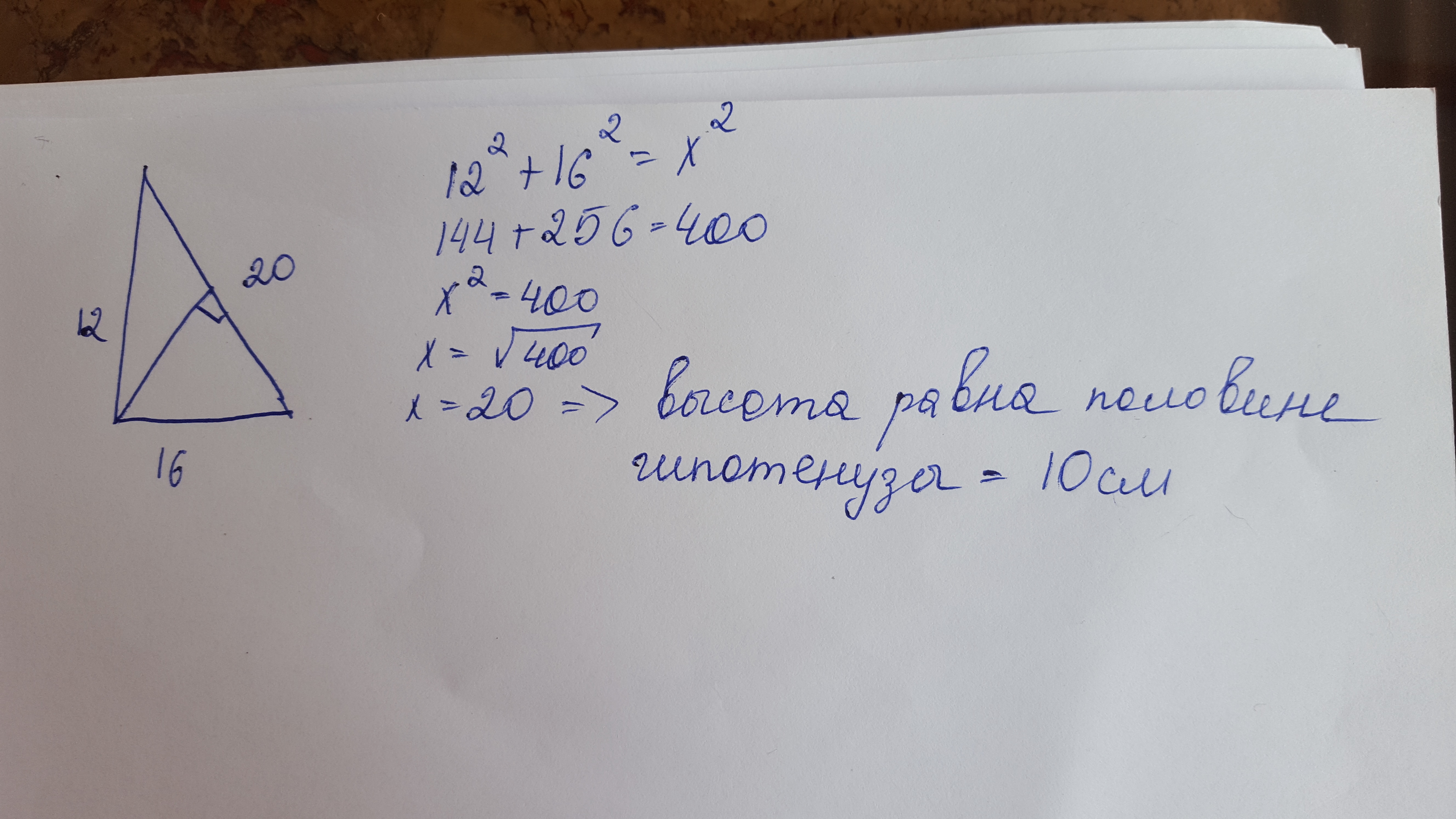 Найдите высоту прямоугольного треугольника проведённую к его гипотенузе если катеты равны 12 и 16 с