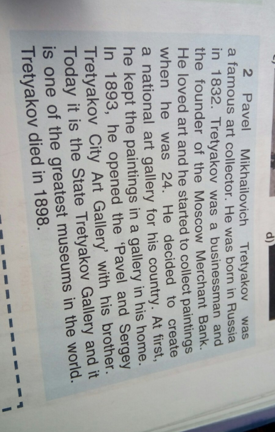 Павел Михайлович Третьяков - известный коллекционер.Он родился в России в 1832 году.Третьяков был деловым человеком и основателем Московского Купеческого Банка.Он обожал искусство и начал коллекционировать полотна (картины),когда ему было 24 года.Он решил создать(открыть) художественную галерею для своей страны.В начале,он хранил полотна в своём доме.В 1893 году, он вместе со своим братом открыл Городскую художественную галерею Павла и Сергея Третьяковых.Сегодня эта галерея называется Государственная Третьяковская галерея и является одной из самых великих галерей в мире.Третьяков скончался в 1898 году.