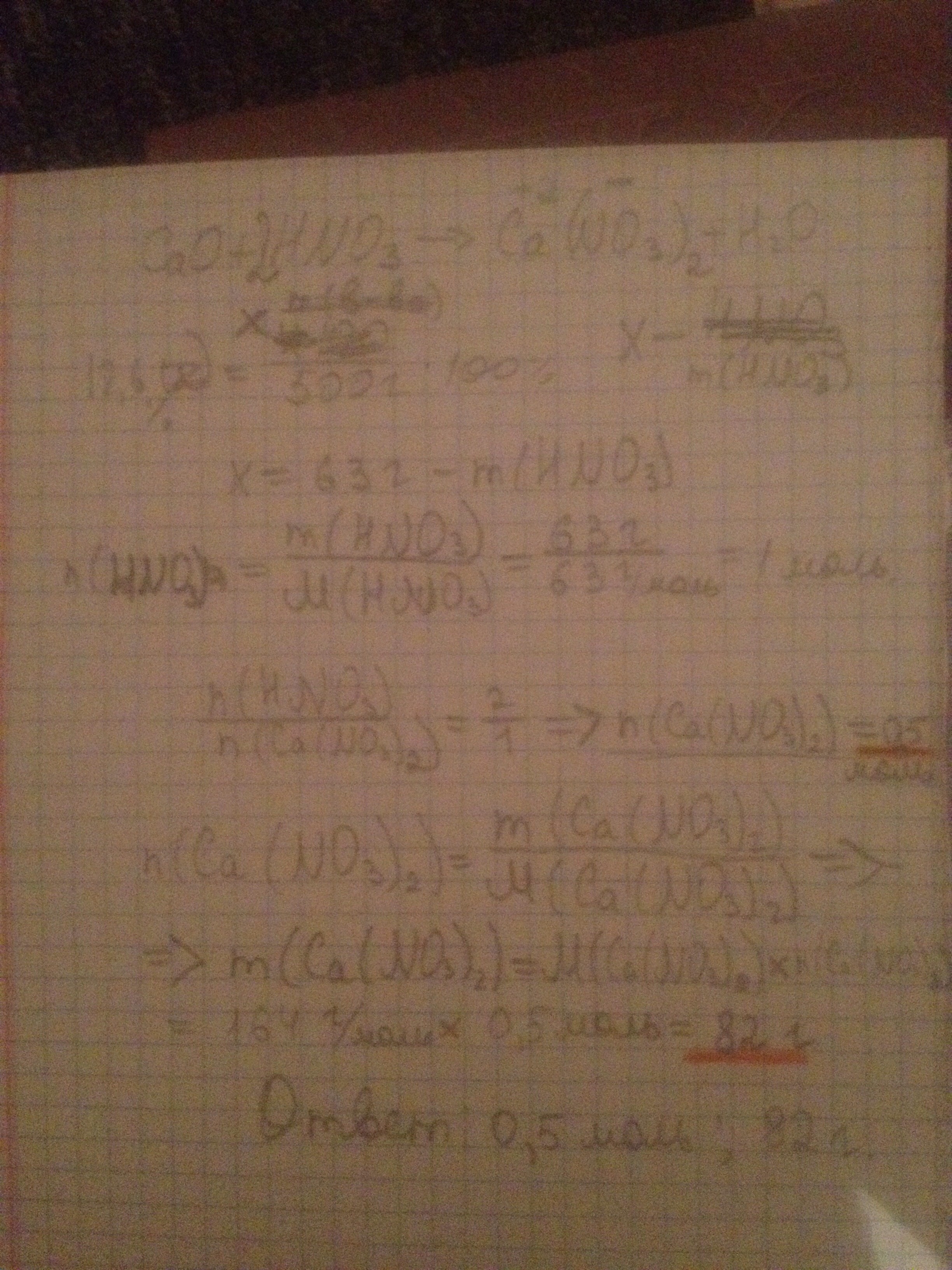 Оксид кальция обработали раствором массой 500 г с массовой долей азотной кислоты 12,6%. Вычислите количество вещества и массу образовавшейся соли.
