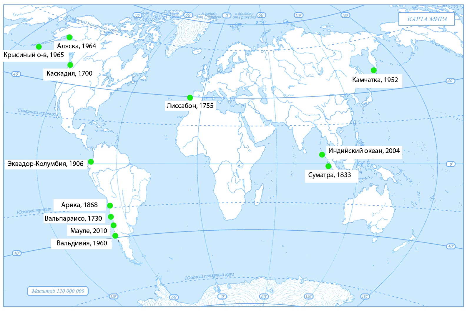 Самые сильные землетрясения происходят обычно там, где сталкиваются океаническая и континентальная плита. Эти районы и являются самыми опасными в мире - это Япония, которая названа фабрикой землетрясений, Чили, Индонезия, Перу, район полуостровов Калифорния, Аляска, Камчатка. Однако, сильные землетрясения возможны и в других районах, например, в Китае, Индии, Пакистане. Часть из них связаны с столкновением континентальных плит, а часть - с разломами и горячими точками на платформах.