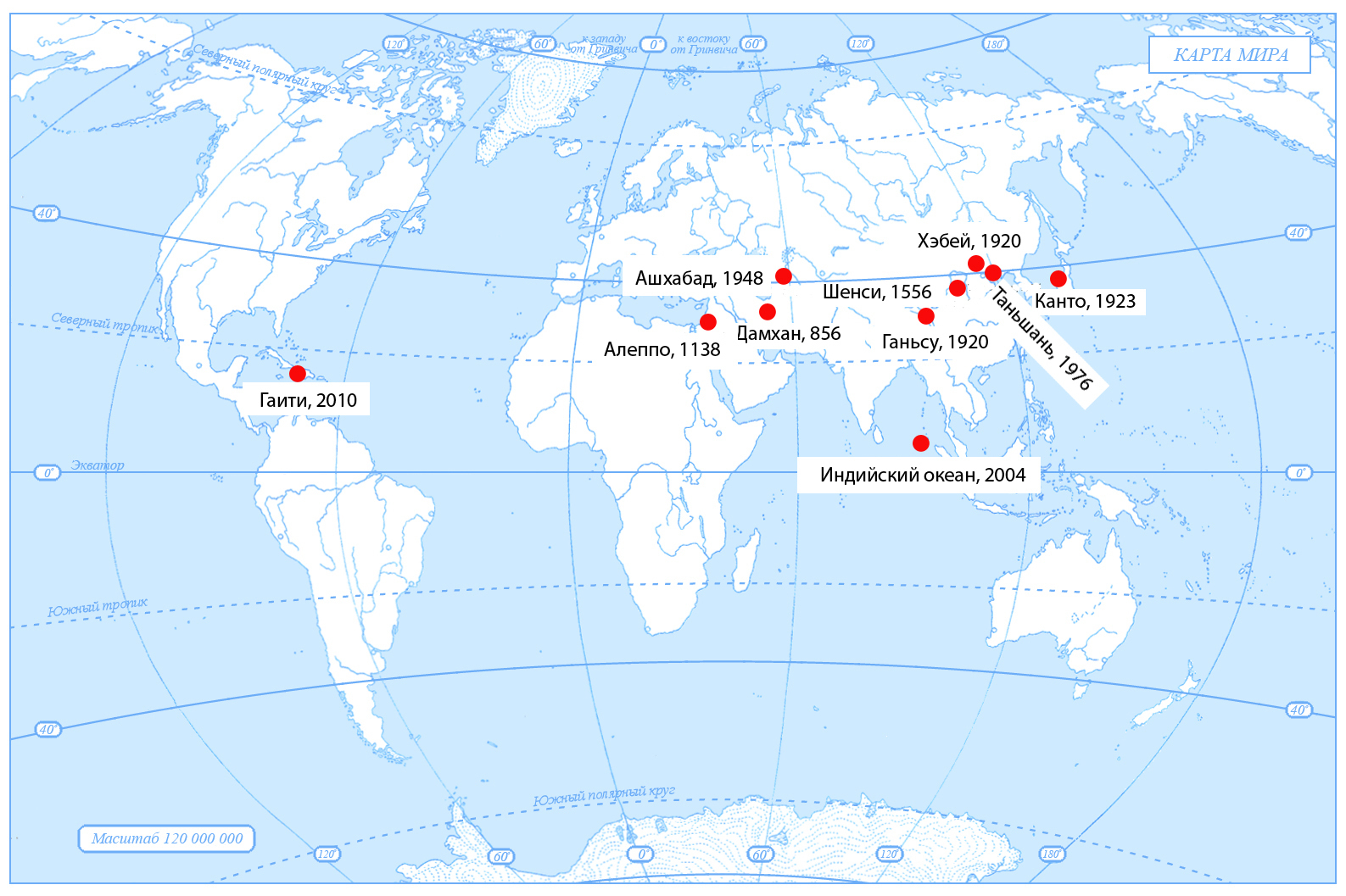 Так, 23 января 1556 года на Китайской платформе произошло сильнейшее землетрясение, которое оценивается по шкале Меркалли в 11 баллов, и приведшее к гибели почти 1 млн. человек. Землетрясение считается самым смертоносным из всех произошедших на Земле. Оно носит название «Великое землетрясение Шенси». 16 декабря 1920 года на Китайской платформе произошло еще одно катастрофическое землетрясение («Великое землетрясение Ганьсу»), приведшее к гибели 234 тысяч человек. Были сильные землетрясения и на территории бывшего СССР и даже Беларуси (1976 год на Туранской платформе 10-балльное Газлийское землетрясение, 1908 год на Русской платформе 7-балльное Гудогайское землетрясение).