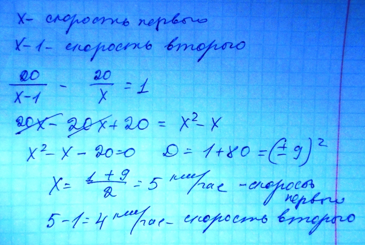 Из пунктов А и В одновременно навстречу друг другу вышли два пешехода.Скорость первого на 1 км/ч больше скорсти второго,поэтому он прибыл в пункт В на 1 ч раньше,чем второй в пункт А.Найдите скорости пешеходов,если расстояние между пунутами А и В ровно 20 км