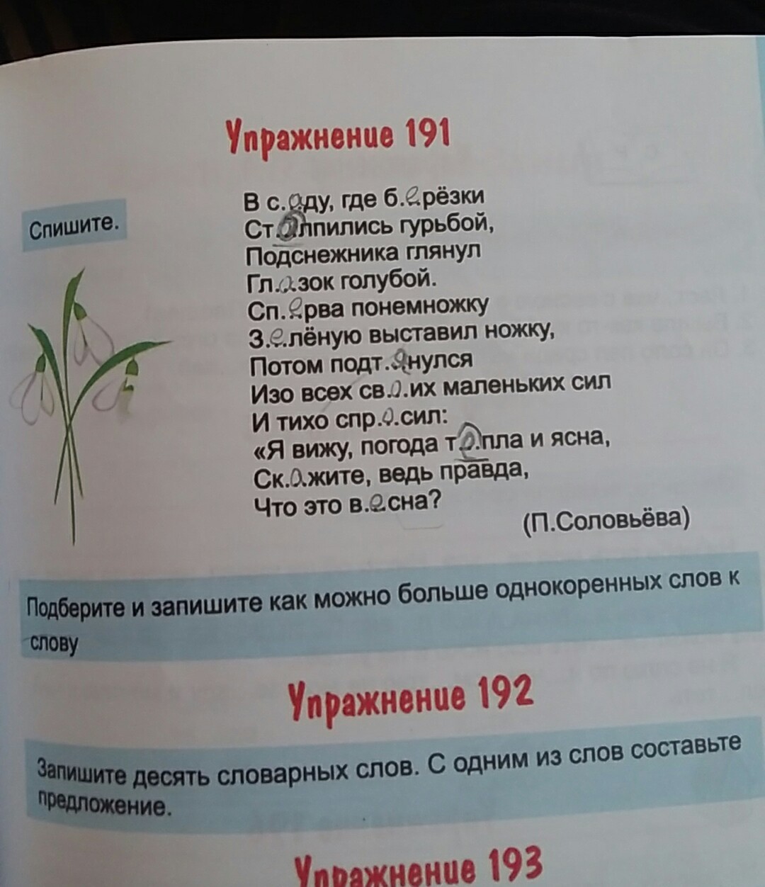 В саду-сад, берёзка-берёзонька, сл.,столпились-толпы,глазок-глаз,сперва-первый,зелёную-зелень,подтянулся-тянет,своих-свой,спросил-спросит,тепла-тёплый,скажите-скажет,весна-вёсны.