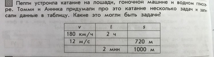 Пеппи устроила катание на лошади, гоночной машине , и водном глиссере. Томми и Анника придумали про это катание несколько задач и записали данные в таблицу. Какие это могли быть задачи ?