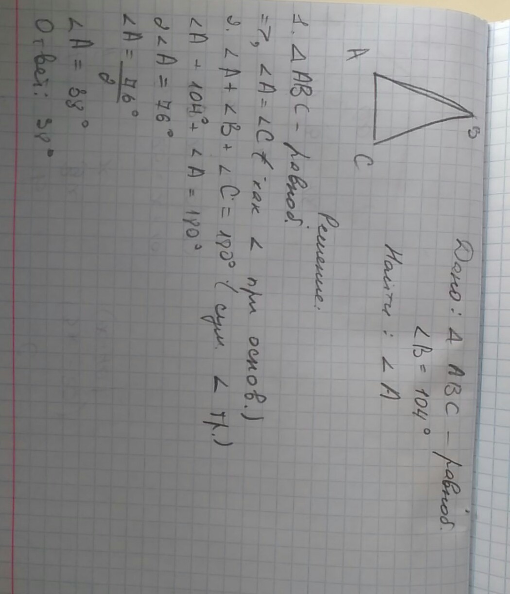 Один из углов равнобедренного треугольника 104 градуса Найдите один из других его углов )) зарание спасибо ))