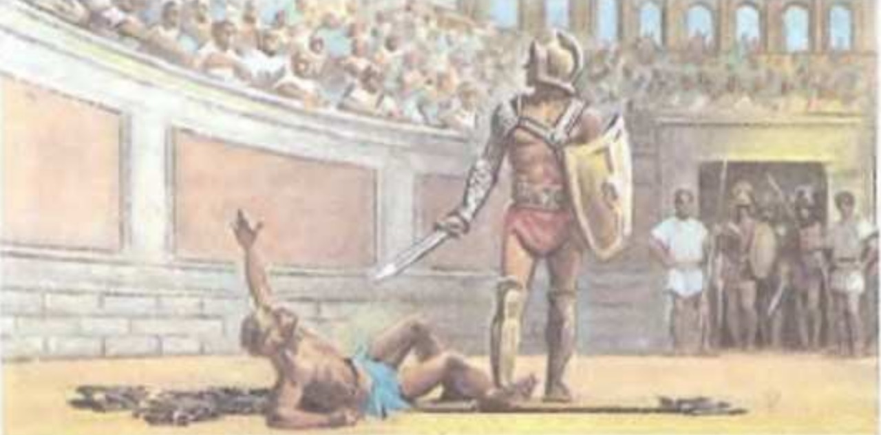 сражение гладиаторов,он победил и теперь люди которые смотрят должны вынести вердикт убивать его или не (у людей руки повёрнуты вниз)