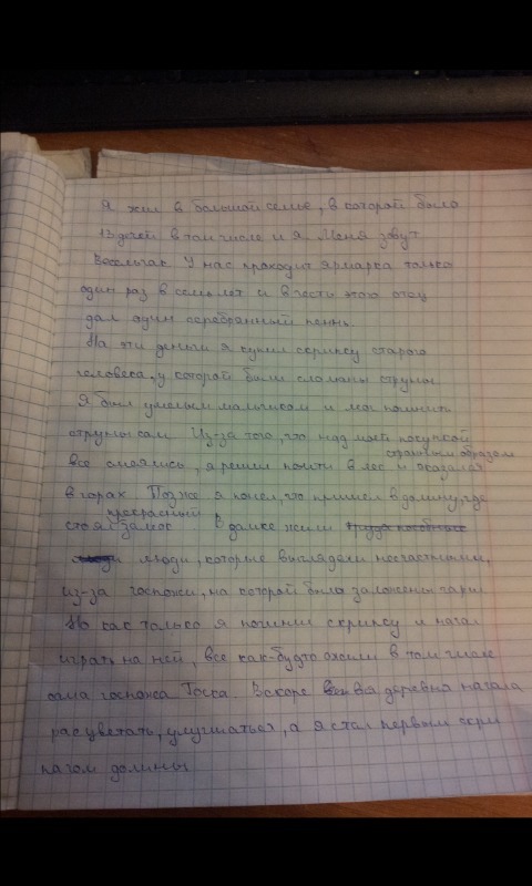 I lived in a big family,there were 13 children, including me. My name is Veselchak. Once in seven years we have a fair. That's why my father gave me a silver penny.I bought the old man's violin with broken strings.I was a skillful boy and could fix the strings myself. As everyone was laughing at my purchase, I decided to go to the forest. And strangely, I turned out to be in the mountains. Later I realized that I came to the valley, where a beautiful castle was.People who lived in the castle looked unhappy, because their mistress had been enchanted. But as soon as I fixed the violin and began playing it, everyone somehow сame to life, including Madame Tosca herself. Soon the whole village blossomed, and I became the first violinist.