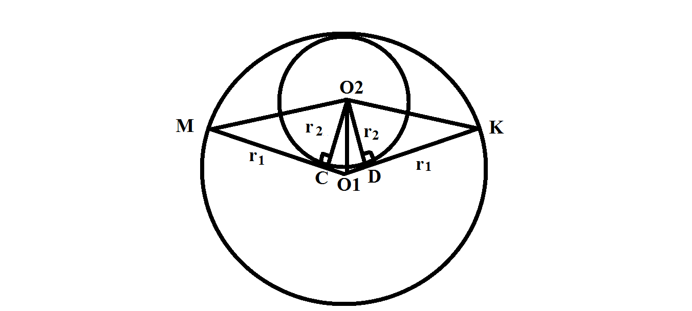 На окружности с центром О¹ радиуса r¹ Андрей взял точки М и К. В центральный угол МО¹К он вписал окружность с центром О² радиуса r² . Андрей просит вас, найдите площадь четырёхугольника МО¹КО²!