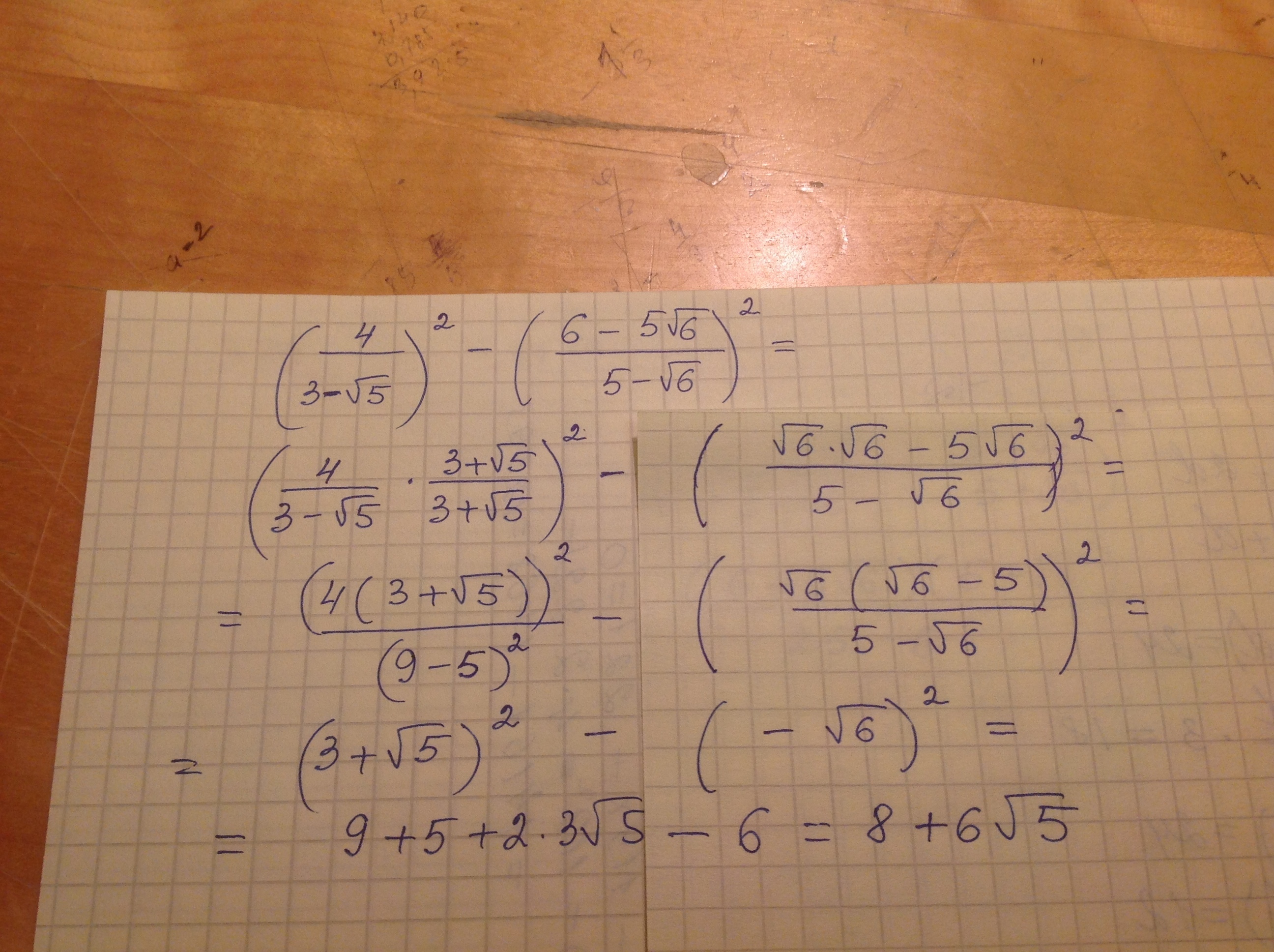 ( frac{4}{3- sqrt{5} })^2 -( frac{6-5 sqrt{6} }{5- sqrt{6} } )^2