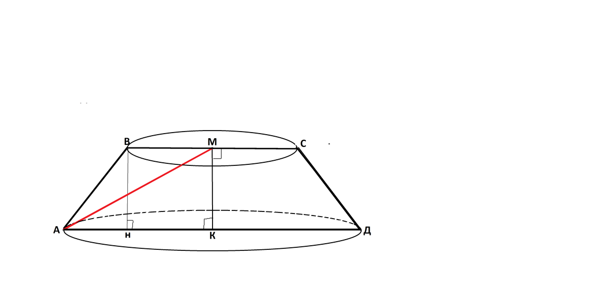 Из центра М верхнего основания опустим перпендикуляр МК к середине нижнего основания.