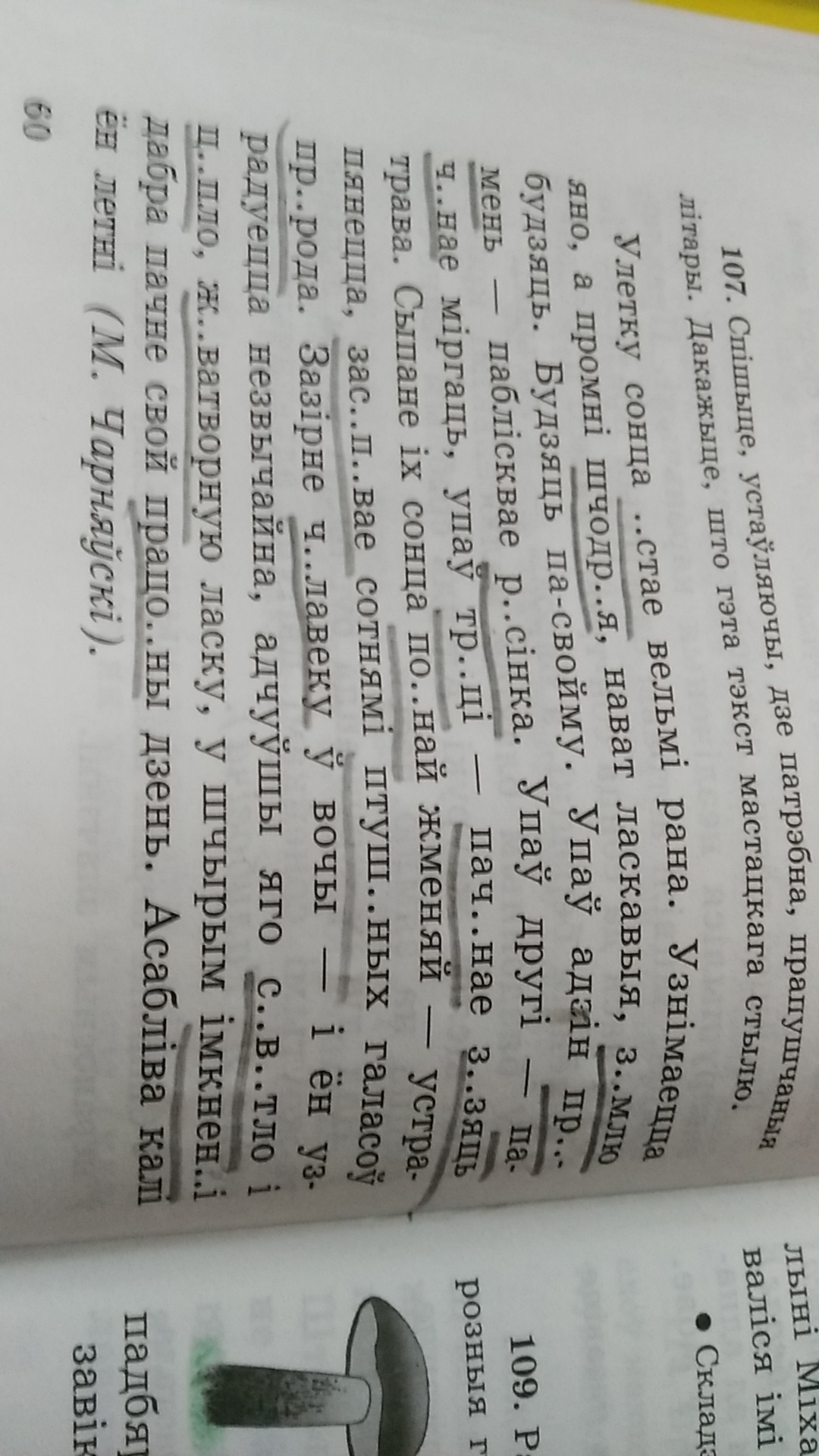 ўстае,шчодрыя, зямлю, прамень, расінка, пачынае,трэці, пачынае, заззяць, поўнай , заспявае, птушыных,прырода, чалавеку, цяпло , святло, жаватвоўную, імкенні , працоўную.