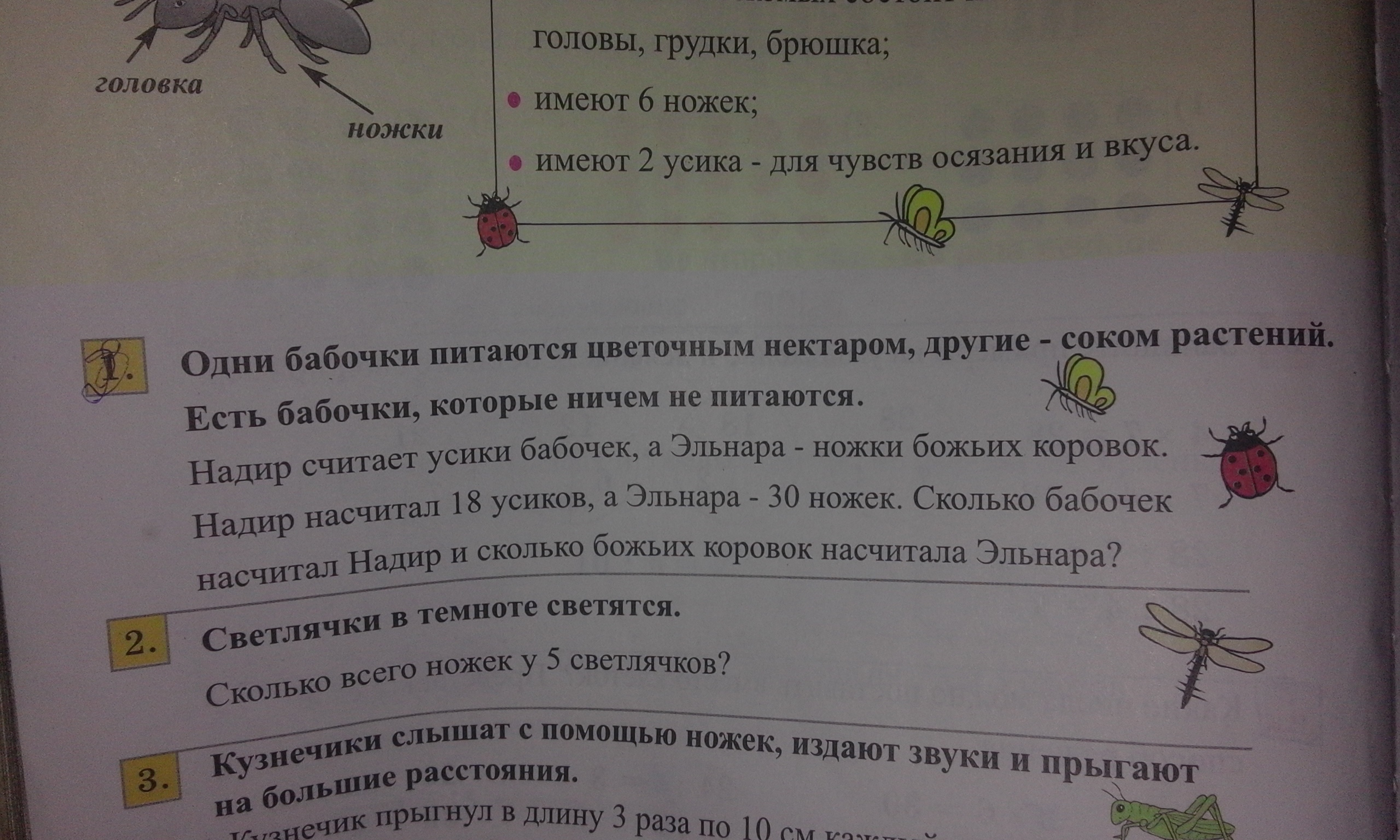 Р.S. 18 делим на 2 потому, что у бабочек по 2 усиков; 30 делим на 6 потому, что у божьих коробок по 6 ножек
