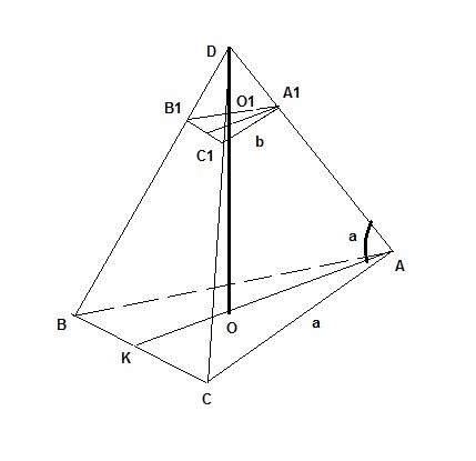 Найти объем правильной треугольной усеченной пирамиды, если стороны верхнего и нижнего оснований равны соответственно а и б(а больше б), а боковые ребра пирамиды образуют с плоскостью основания угол альфа ( решить пожалуйста подробно )