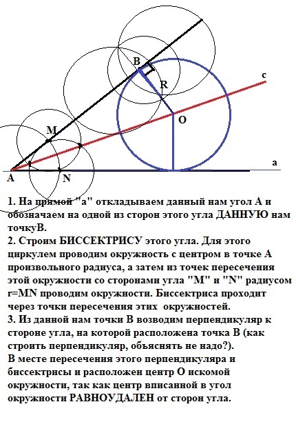 В месте пересечения этого перпендикуляра и биссектрисы и расположен центр О искомой окружности радиуса R=ОВ, так как центр вписанной в угол окружности РАВНОУДАЛЕН от сторон угла - то есть лежит на биссектрисе угла.