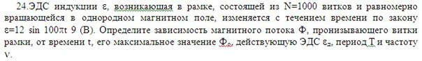 ЭДС индукции e, возникающая в рамке, состоящей из N=1000 витков и равномерно вращающейся в однородном магнитном поле, изменяется с течением времени по закону e=12 sin 100pt 9 (В). Определите зависимость магнитного потока Ф, пронизывающего витки рамки, от времени t, его максимальное значение Фо, действующую ЭДС e(д), период и частоту.