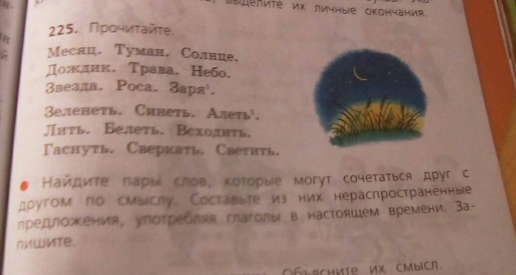 Месяц всходит, туман синеет, солнце алеет, дождик льет, трава зеленет, небо белеет, звезда гаснет, роса сверкает, заря светит.