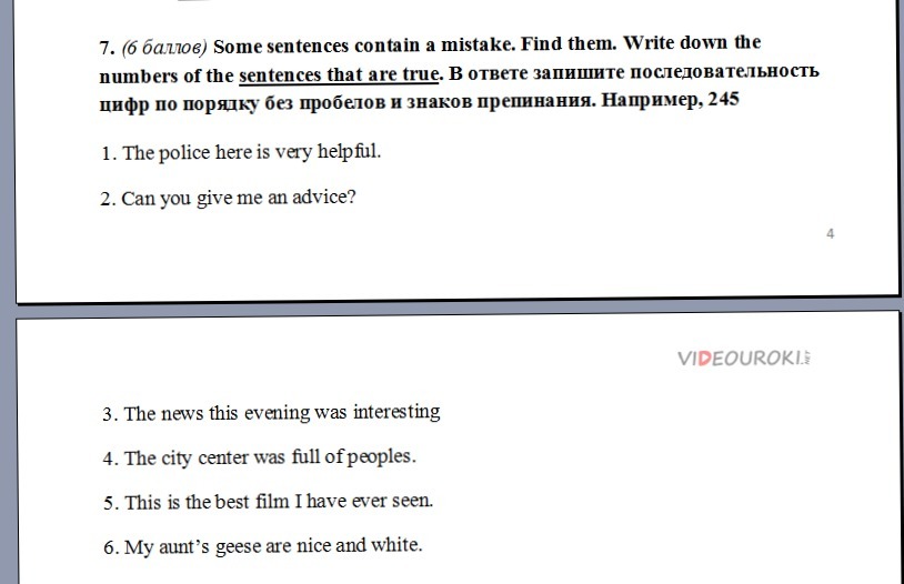 кстати, второе мб тоже правильно, хотя можно и так, как исправили сверху. во втором устойчивое выражение piece of advice, в третьем news - множественное число, а написано was, что относится к единственному. в четвертом peoples, такого слова нет. в шестом единственное число geese, а написано are , оно употребляется с множественным числом