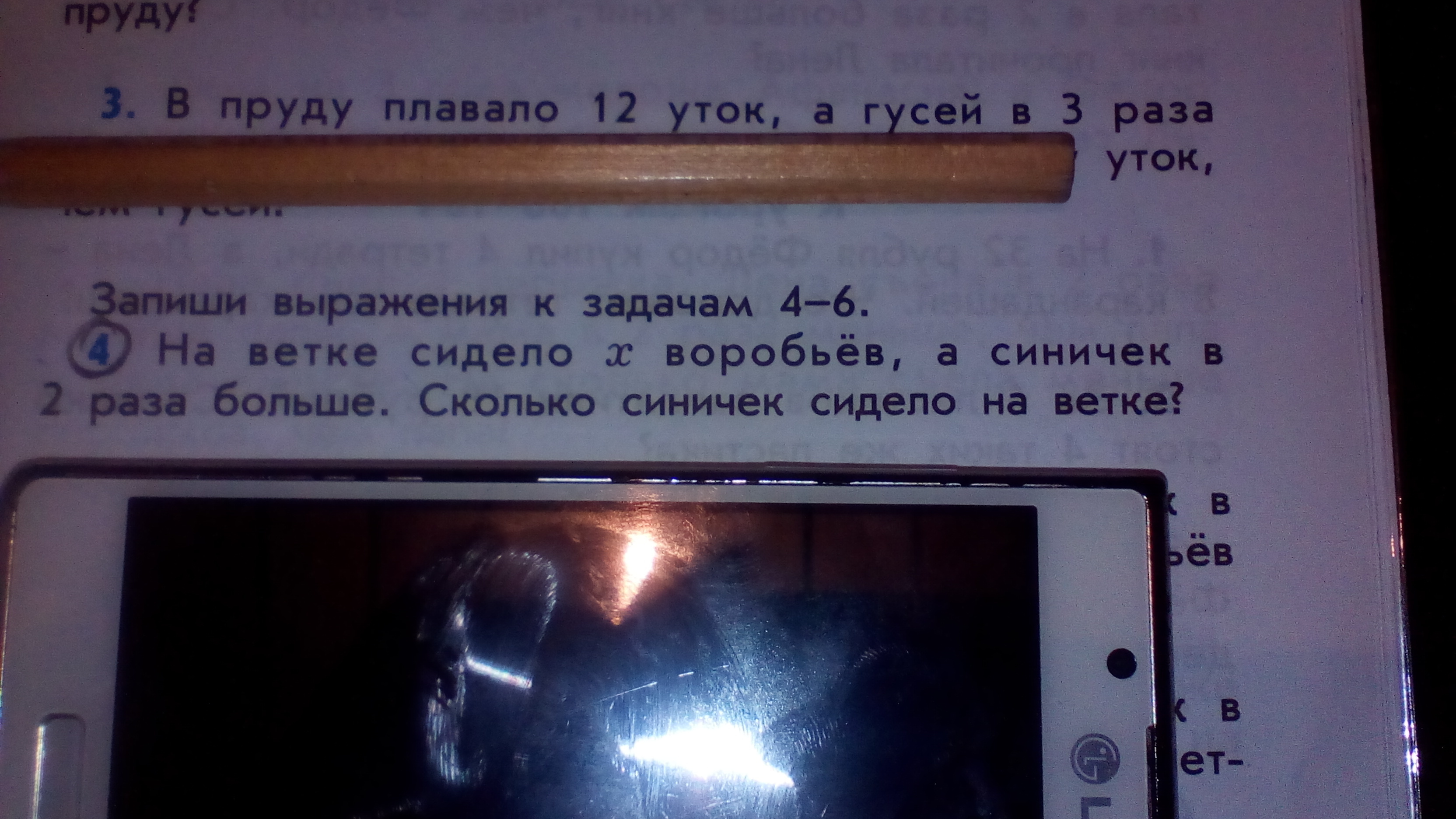 воробьев было х, а синичек в 2 раза больше значит синичек было 2 x