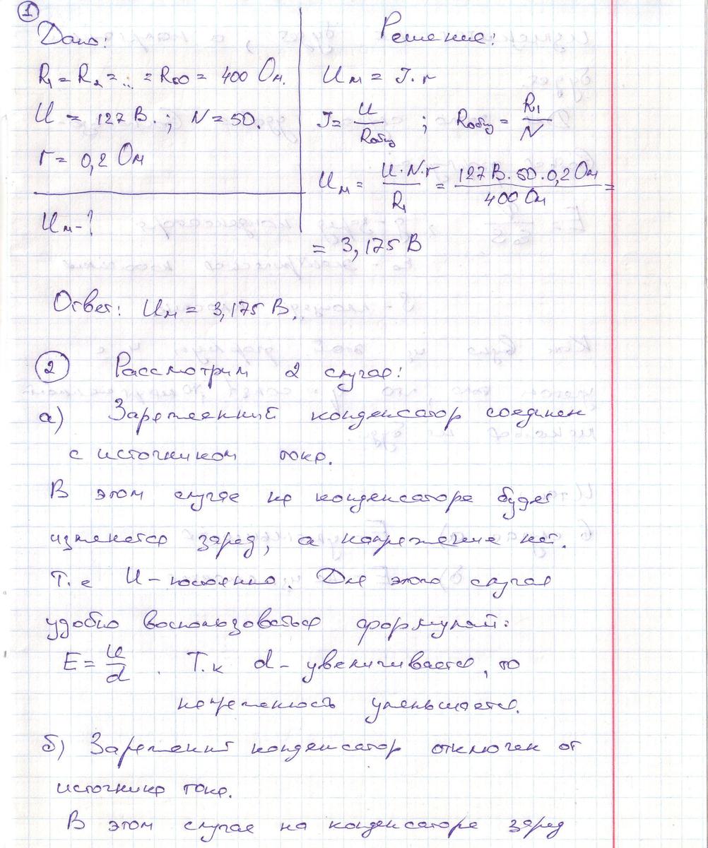 Помогите , пожалуйста) 1) 50 ламп накаливания сопротивлением 400 Ом каждая соединены параллельно и включены в сеть. Напряжение на лампах 127 В. Сопротивление соединительных проводов 0.2 Ом. Определить падение напряжения на магистрали. 2) Будет ли изменяться напряженность однородного электрического поля плоскости конденсатора, если раздвигать пластины?