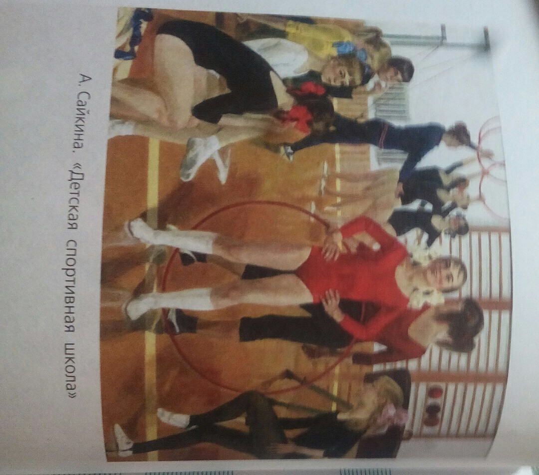 Полотно Сайкиной переносит нас в обычный спортивный зал, на тренировку юных гимнасток. Многоплановый сюжет картины дает ощущение движения, динамики происходящего. Вот на переднем плане девушка в красном купальнике, "переводящая дыхание" после сложного выступления. А вот справа от неё и опоздавшая ученица, на ходу поправляет наспех надетую обувь. Несколько гимнасток на скамье внимаельно слушают объяснения преподавателя. На заднем плане под руководством опытного тренера группа отрабатывает синхронное выступление с обручами. Художница сумела изобразить этих гимнасток почти летящими, нарисовав их в черных купальноках на фоне белой стены зала. Вообще, вся картина решена преимущественно в светлых тонах.