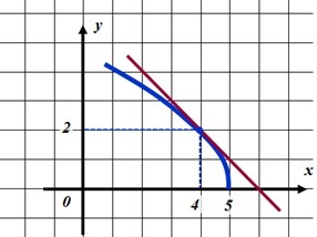 Определите с помощью рисунка, какой угол касательная, проведенная к графику функции f(x)=2√5-x в точке (4;2), образует с положительным направлением оси абсцисс. Ответ дайте в градусах