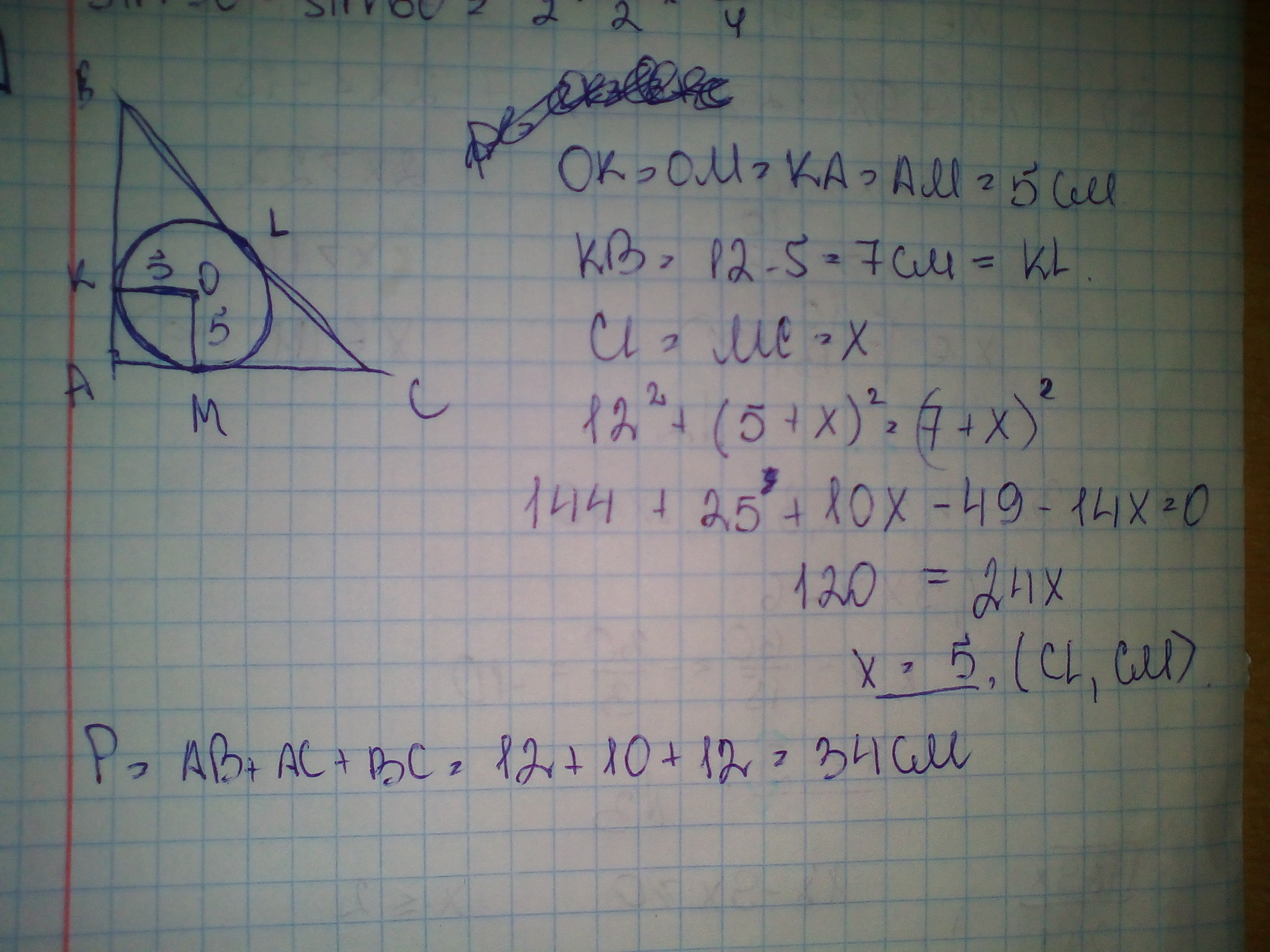 радиус окружности вписанной в прямоугольный треугольник равен 5см а один из катетов 12см найдите периметр этого треугольника