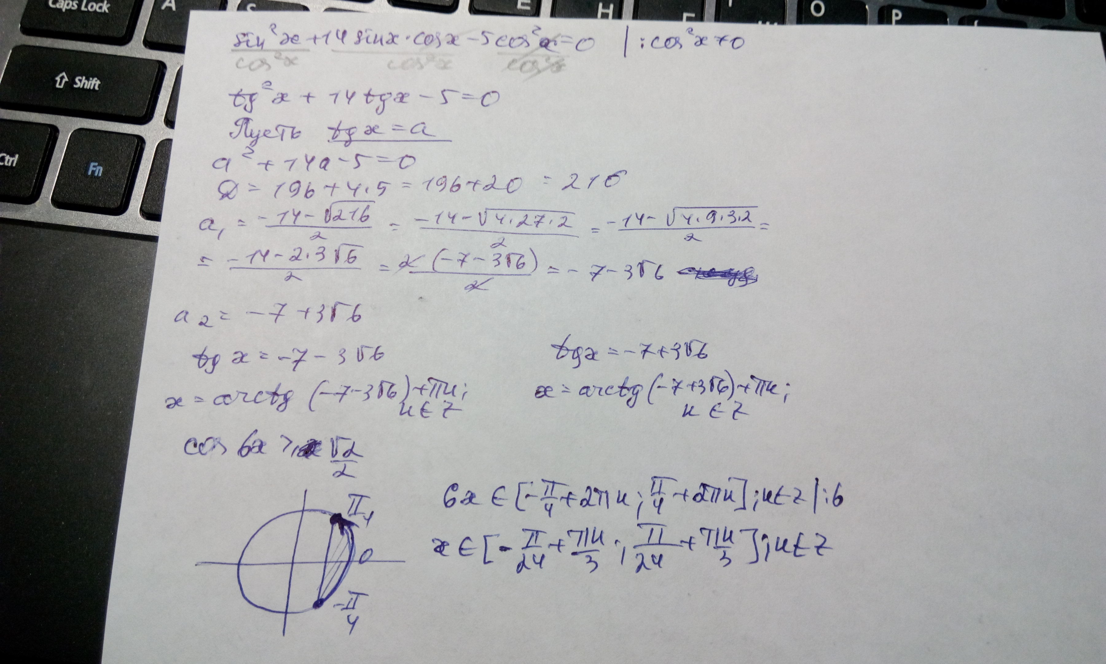 1) sin^2(x)+14sinxcosx-5cos^2(x)=0 (Мне вроде этот пример понятен , но тут не выходит нормальный дискриминант.. из-за этого я засомневался..)