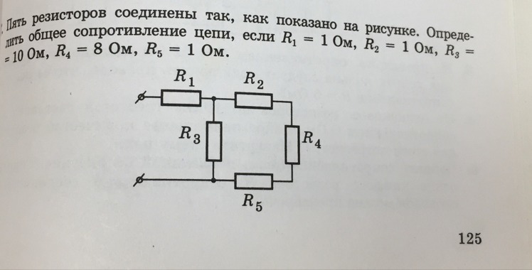 Rобщ=R1+(1/(R2+R4+R5)+1/R3)^-1; Rобщ=1+(1/(1+8+1)+1/10)=6 Ом