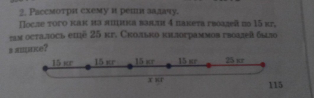 После того как из ящика взяли 4 пакета гвоздей по 15 кг,там осталось ещё 25 кг.Сколько килограммов гвоздей было в ящике?