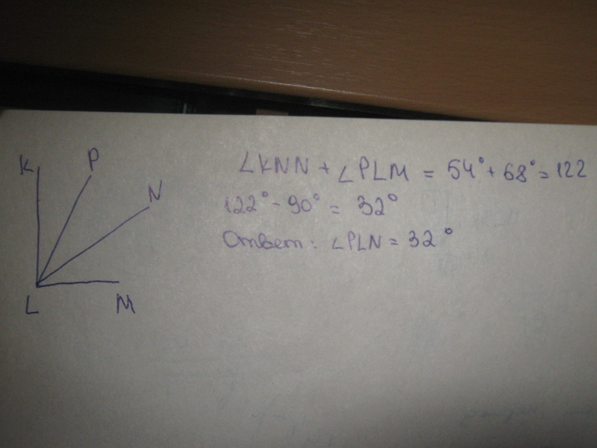 с вершины прямого угла KLM проведено два луча LP и LN так,что угол KLN=54 градуса,а уголPLM=68 градусов.Найдите градусную меру угла PLN.
