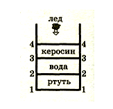 плотность керосина меньше чем вода и ртуть поэтому наверху, у ртути наоборот плотность больше всех, вопрос на каком уровне будет плавать кусок льда. Точно незнаю но лед это та же вода может быть имеет плотность почти такую как и вода, может быть чуть больше вывод кусок льда по плотность меньше керосина, но больше воды поэтому будет плавать между ними ОТвет 3-3