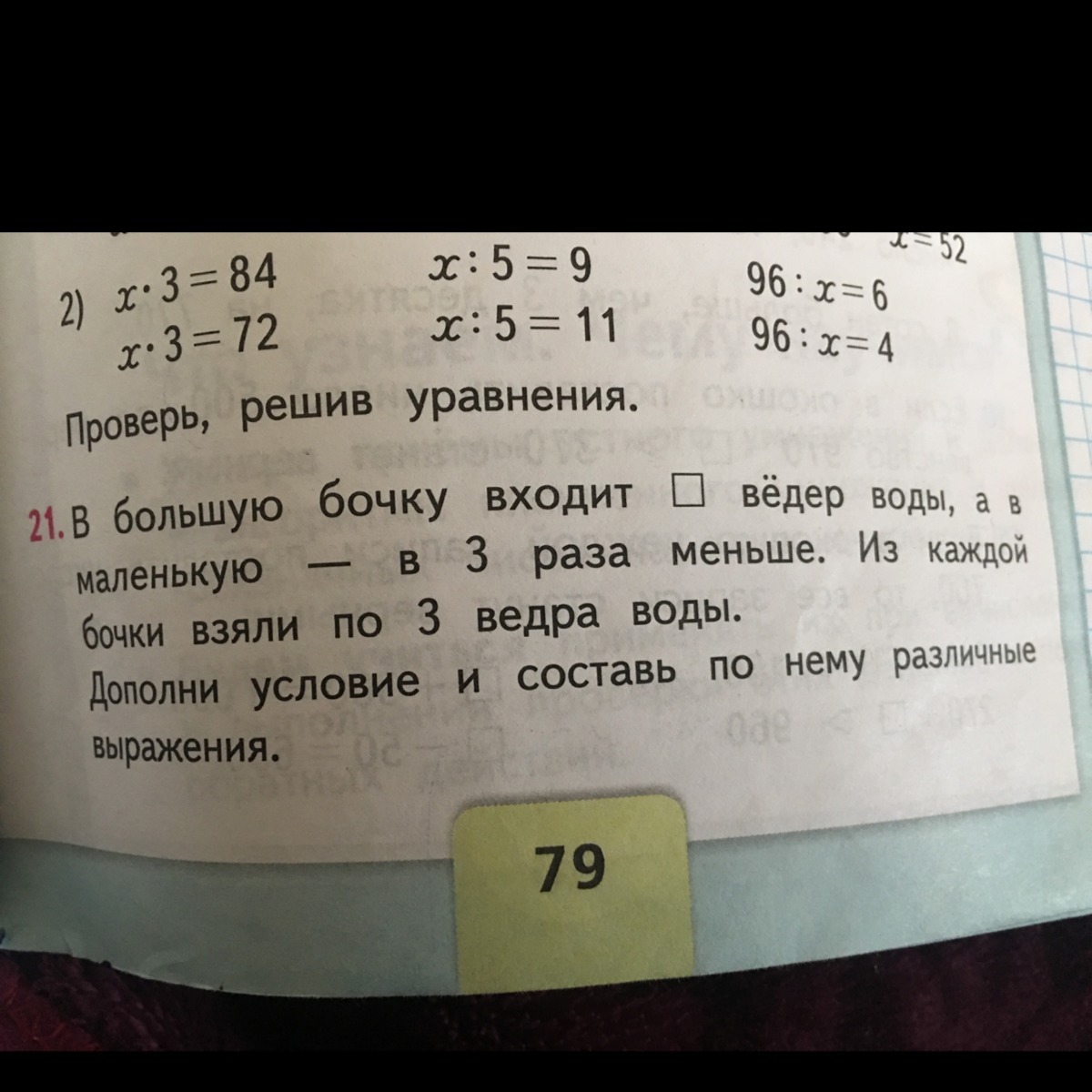 В большую бочку входит ? Вёдер воды. А в маленькую-в 3 раза меньше. Из каждой бочки взяли по 3 ведра воды. Дополни условие и составь по нему различные выражения.