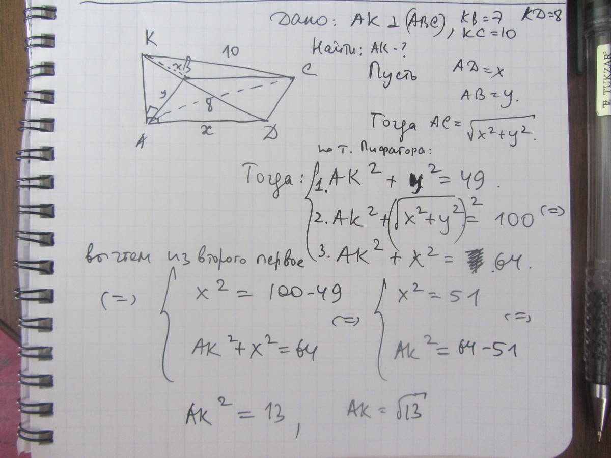 Из вершины А прямоугольнике АБСД восстановлен перпендикуляр АК и его плоскости, расстояние ну конуса К которого до других вершин равна 7,8, и 10м. Найти длину перпендикуляра АК. напишите с доно, решением и с рисунком. Пожалуйста ребят.