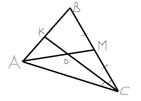 Обозначим точку пересечения АМ и CK через О. Рассмотрим треугольник АBС.