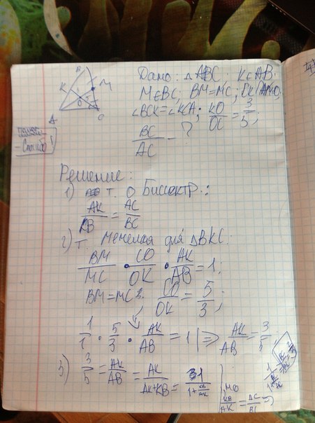 в треугольнике abc медиана am делит биссектриссу ck в отношении 5:3, считая от вершины с. Найти отношение длин сторон треугольникa ac и bc(большей к меньшей)