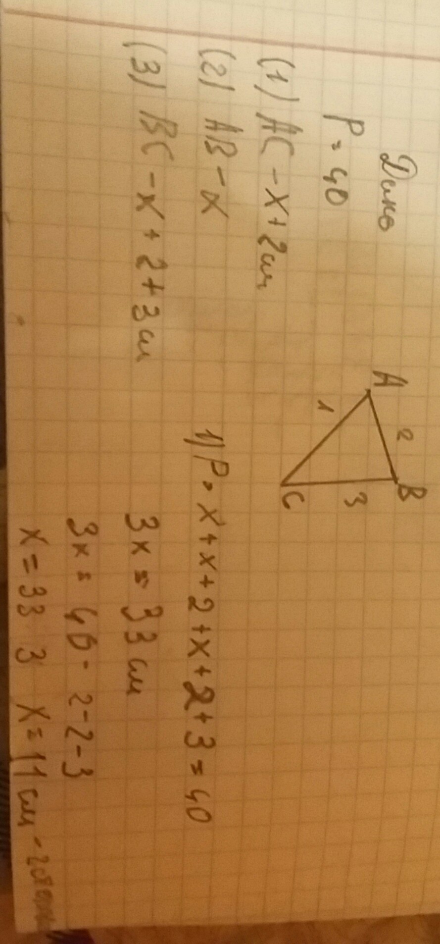 периметр треугольника равен 40 сантиметров длина первой стороны на 2 сантиметра больше чем длина второй, а длина третьей стороны на 3 см больше чем длина 1 найди длину каждой стороны треугольника