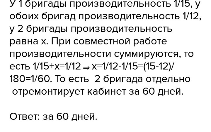 Работу по ремонту кабинета школы выполняли 2 бригады. Первая бригада от ремонтирует кабинет за 15 дней , а вместе со 2 бригадой за 12 дней , за какое время с этой задачей справится 2 бригада