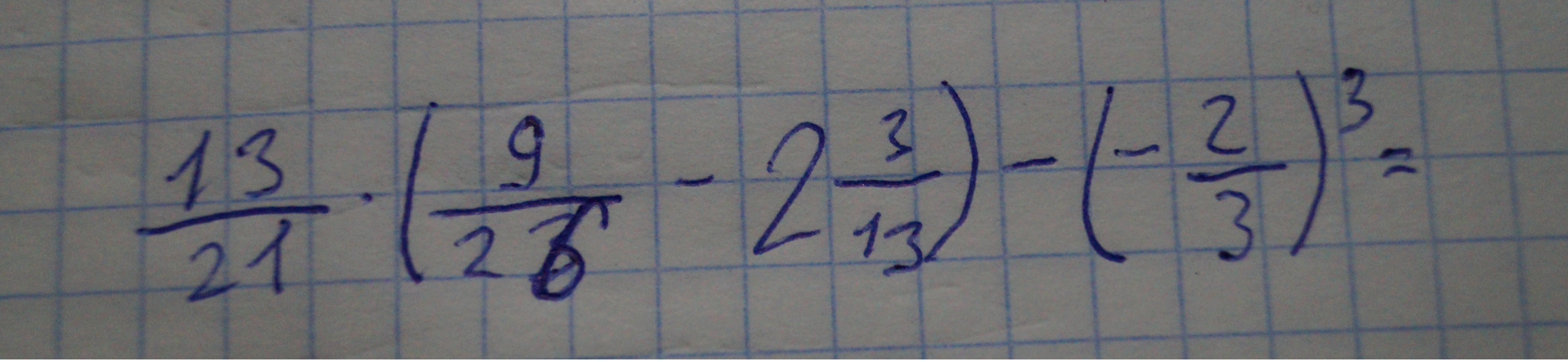 1)9/26-2.3/13= 9/26- 2.6/26= -1.23/26. 2)13/21*(-2.23/26) = 13/21*75/26= 25/14. 3) 25/14-(-2/3)= 175/3= 58.1/3. Вместах после цифр точки - Это целая часть т.е 2.6/26 это 2 целые 6 двадцать шестых