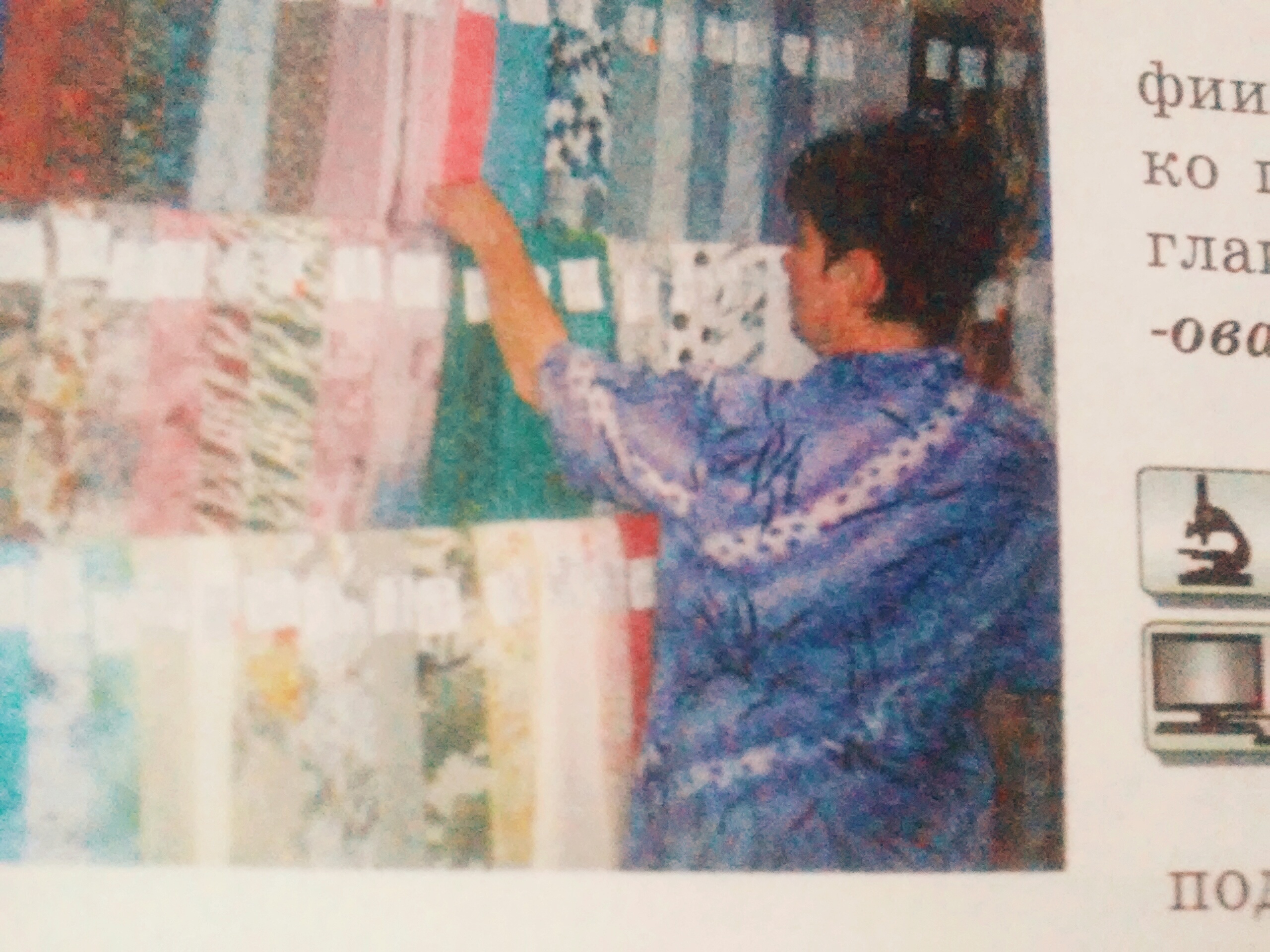 Продавец вытаскивает нужную ткань , разглаживает складки на ней.