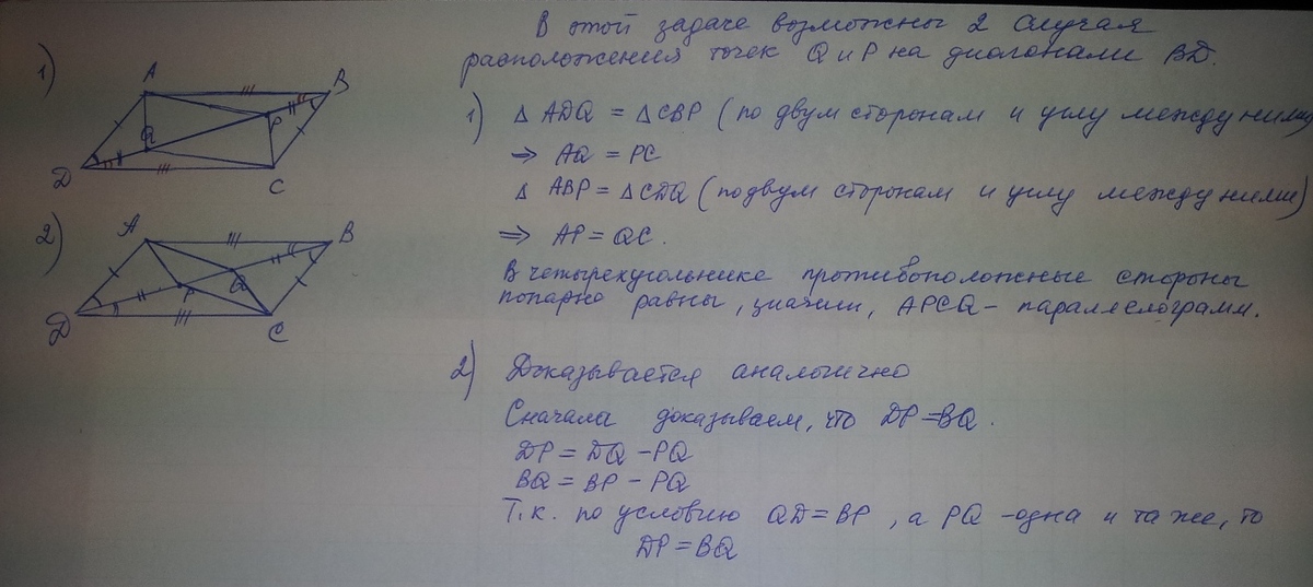 на диагонали BD параллелограмма ABCD отмечены две точки P и Q, так, что PB=QD. Доказать, что четырехугольник ACPQ - параллелограмм.