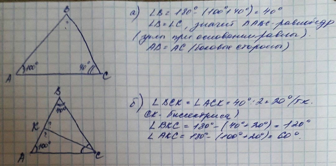 Ребят, помогите решить, срочно нужно.1. В треугольнике ABC угол А=100 градусов, угол С=40 градусов.а) Докажите, что треугольник ABC - равнобедренный, и укажите его боковые стороны.б) Отрезок CK - биссектриса данного треугольника. Найдите углы, которые она образует со стороной AB.