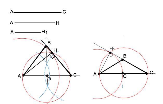 На произвольной прямой циркулем откладываем отрезок АС, равный заданной длине основания треугольника. По общепринятой методике строим срединный перпендикуляр этого отрезка, который пересекает его в т.О. АО=CО. Из т.А чертим окружность, радиус которой равен заданной длине высоты АН. Основание Н высоты будет расположено на построенной окружности. Т.к.высота должна быть перпендикулярна боковой стороне треугольника, на АВ как на диаметре с центром в т.О чертим окружность. Точку ее пересечения с первой окружностью обозначим Н. Угол АНС=90°, т.к. опирается на диаметр.