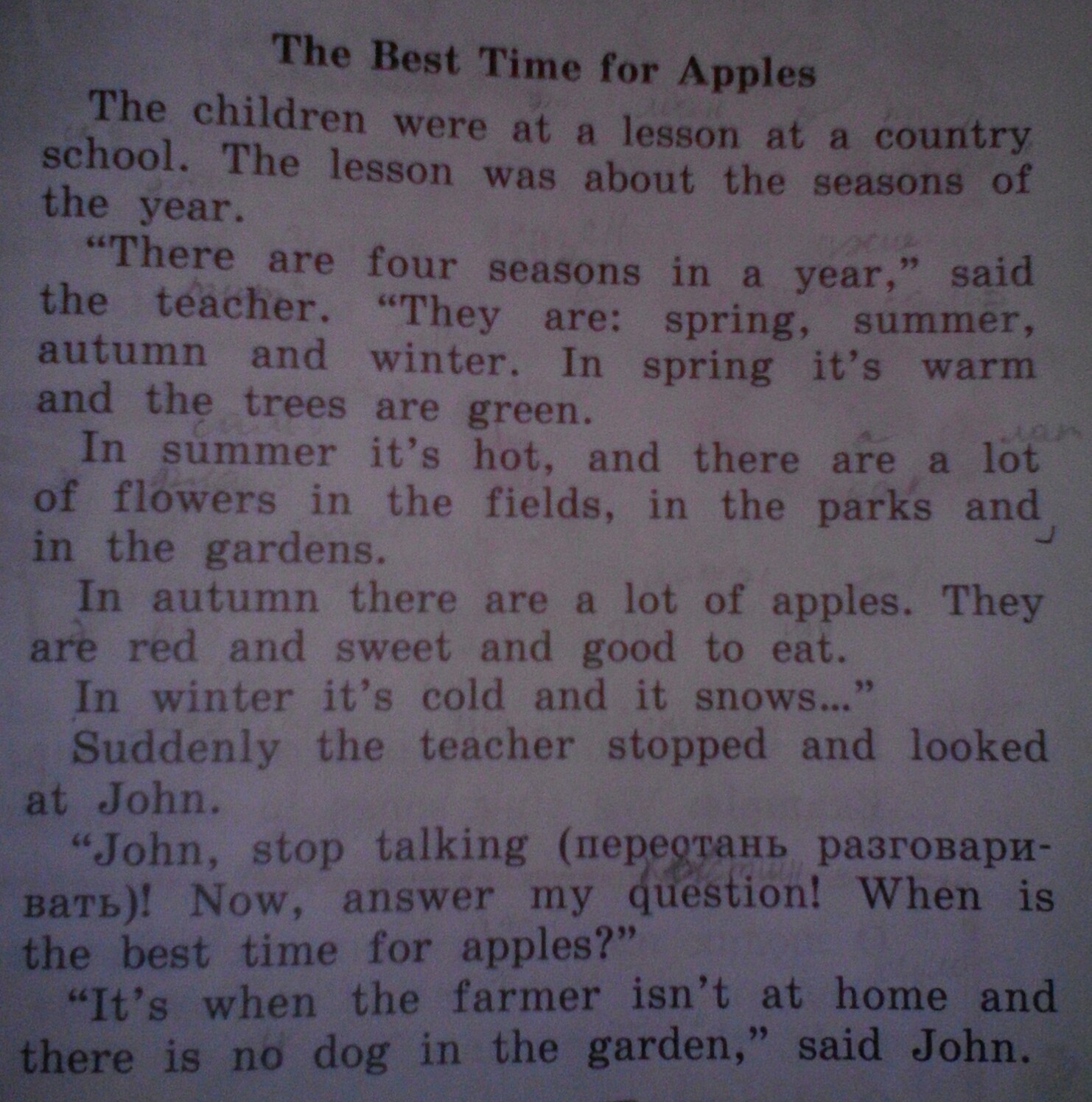 Лучшее время для яблок Дети были на уроке в сельской школе. Урок был о сезонах года. «В указанном году есть четыре сезона, учитель». Это весна, лето, осень и зима. Весной тепло, а деревья зеленые. Летом жарко, и на полях, в парках и в садах много цветов. Осенью есть много яблок. Они красные, сладкие и вкусные. Зимой холодно, и идет снег ... »Неожиданно учитель остановился и посмотрел на Джона Барба.) Теперь ответьте на мой вопрос! Когда лучшее время для яблок?» «Это когда фермер не дома, и в саду нет собаки, - сказал Джон.